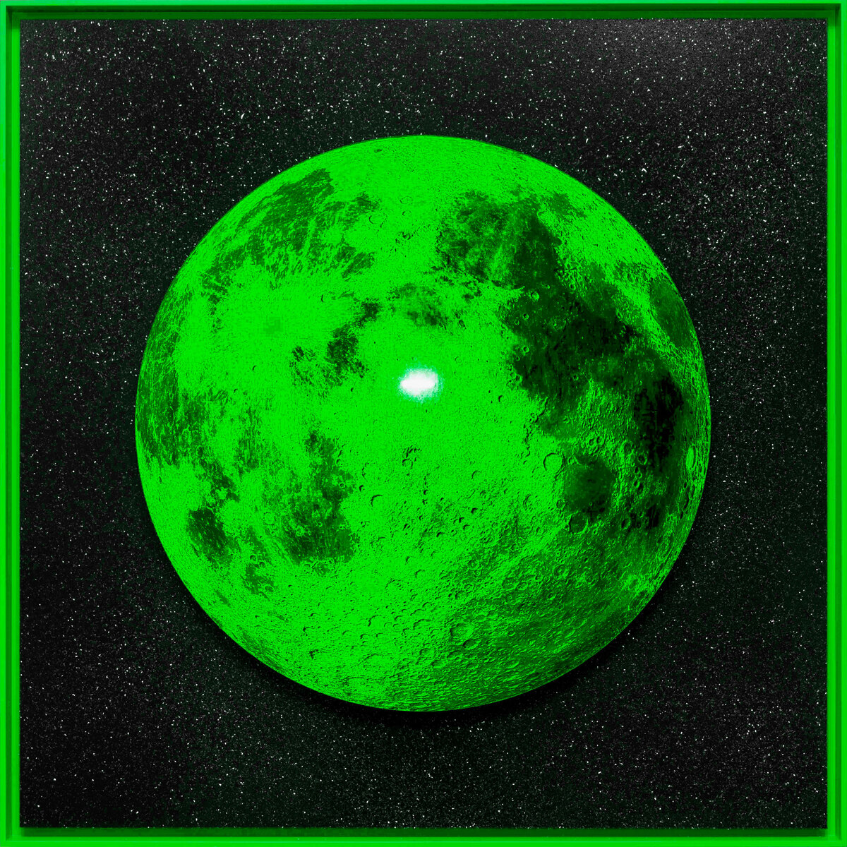 Metallic Print mounted on Acrylic and Black/White Sintra, with floating Aluminum frame. Custom fitted with LED Neon.