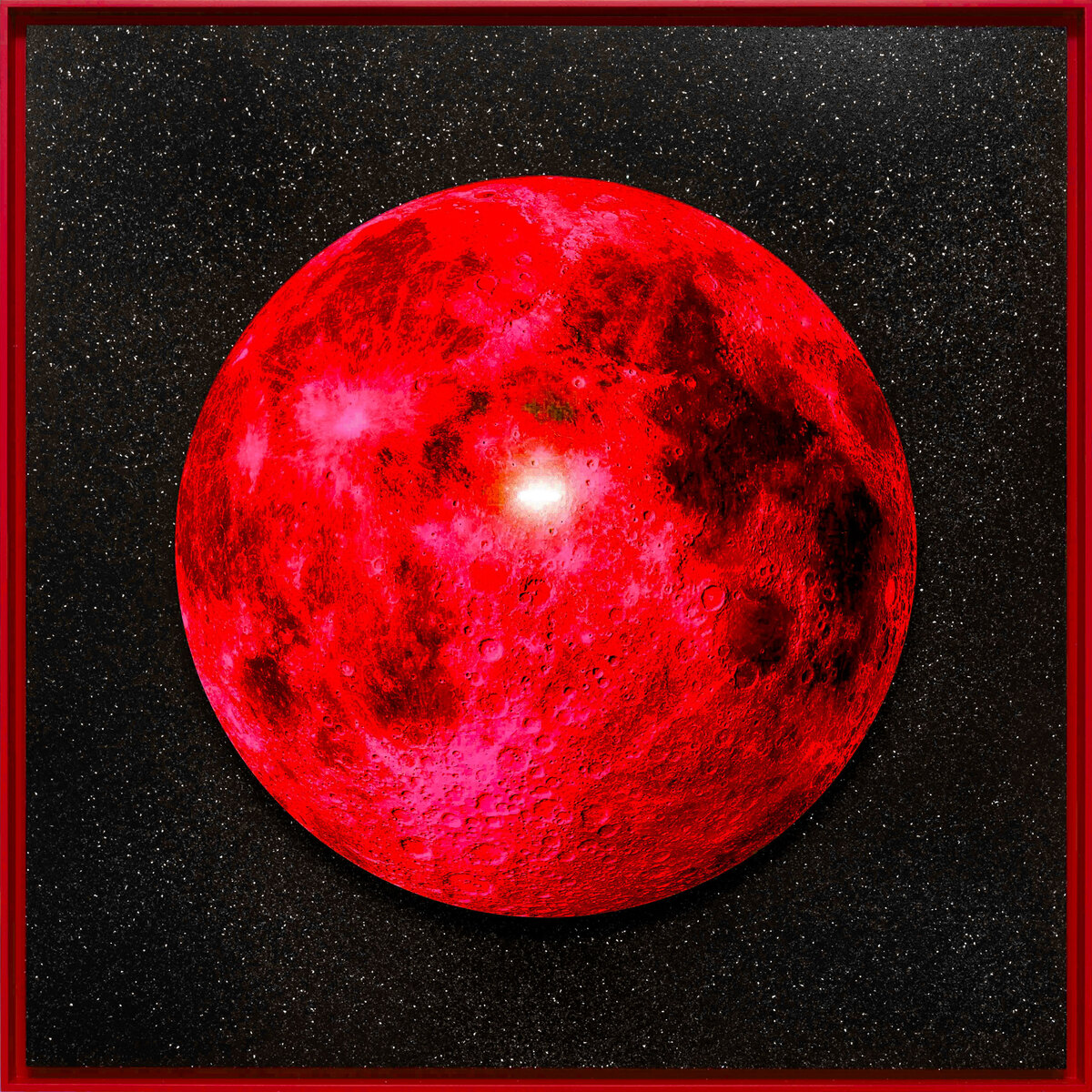Metallic Print mounted on Acrylic and Black/White Sintra, with floating Aluminum frame. Custom fitted with LED Neon.