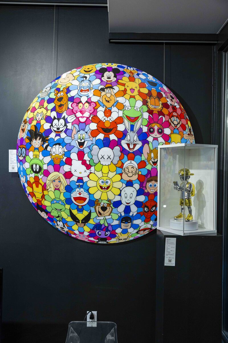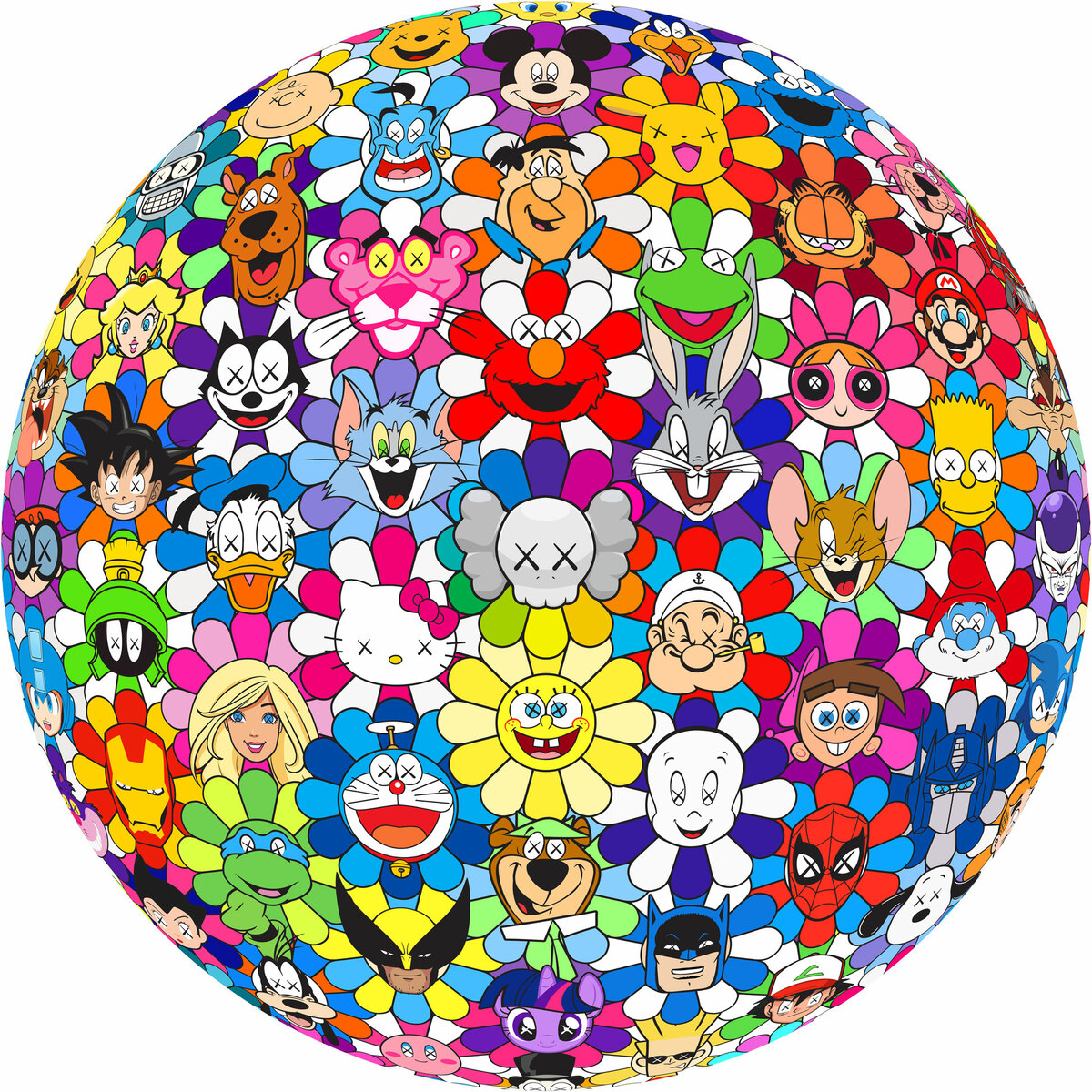 Brace yourself for a burst of color and nostalgia with the "Murakami Cartoon Ball"! This lively piece reimagines Takashi Murakami's iconic smiling flower piece by swapping each one out with your favorite cartoon characters. From the classics like Mickey Mouse, Hello Kitty, Fred Flinstone and Scooby Doo to modern icons like Kaws, Pikachu, Goku and more, this vibrant sphere is a joyful collision of contemporary art and pop culture. Perfect for both art lovers and pop culture enthusiasts, the "Murakami Cartoon Ball" is a playful tribute to the timeless joy of cartoons. This eye-catching piece not only honors Murakami's brilliance but also brings a smile to your face with every look. Add a splash of fun to your collection and let the nostalgia shine!