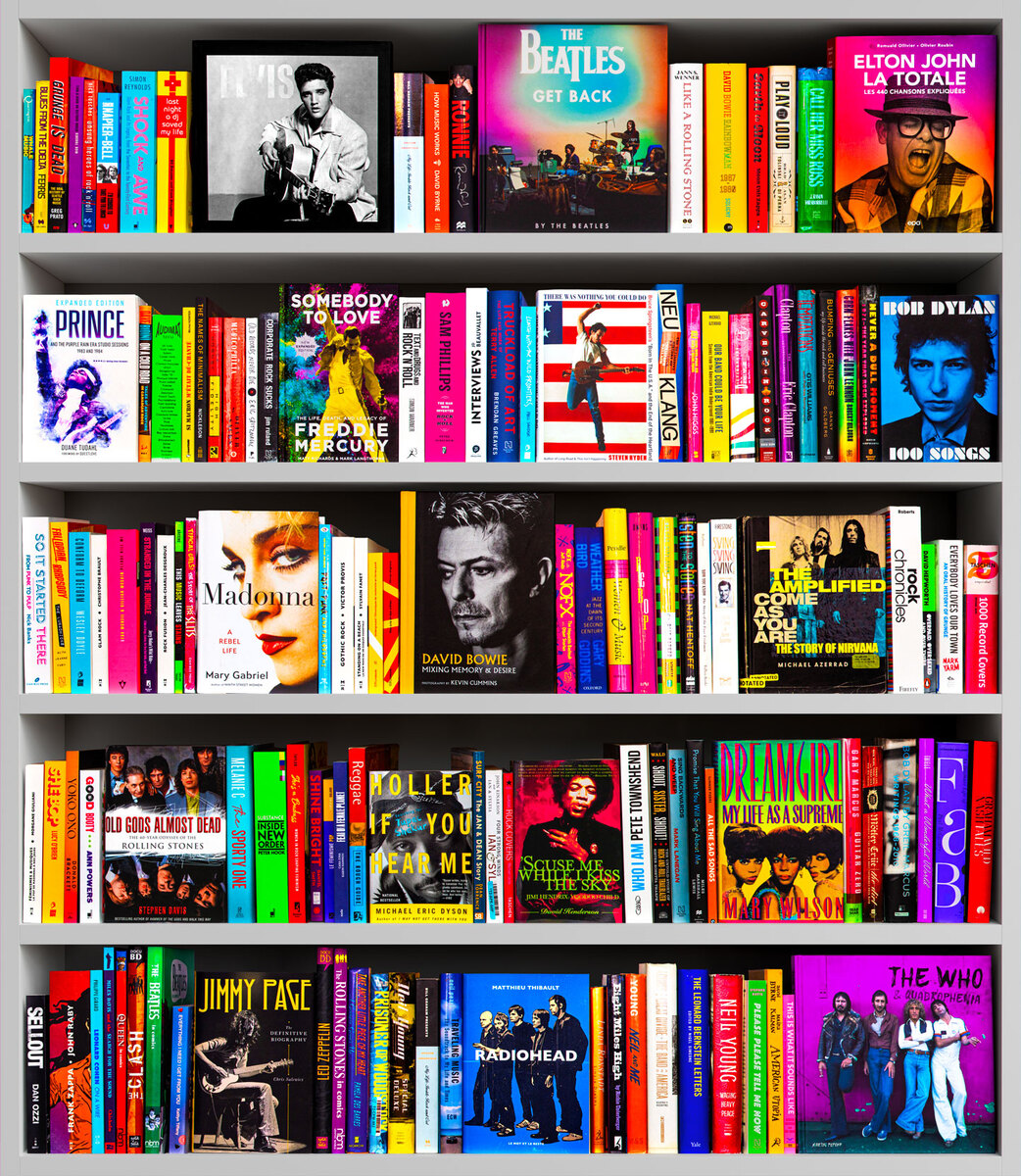 "Music Bookscape V" is a vibrant homage to the world of music and literature, celebrating the intersection of iconic artists and their stories. This meticulously curated piece showcases a dynamic arrangement of books featuring legends like The Beatles, Prince, David Bowie, Elton John, Madonna, and many more. Each spine, cover, and detail bursts with color and personality, creating a visual symphony that resonates with music lovers and art enthusiasts alike. Printed on metallic photo paper and mounted on acrylic, this artwork combines crisp details with a museum-quality finish, enhancing the vibrancy and depth of the image. Backed with aluminum and framed in a sleek, modern design, it is ready to adorn any wall with timeless elegance. This limited-edition piece is a must-have for collectors, available in just 10 per size, signed and numbered. Each artwork comes with a certificate of authenticity, ensuring its uniqueness and value. Transform your space into a celebration of music history and artistic brilliance with "Music Bookscape V".