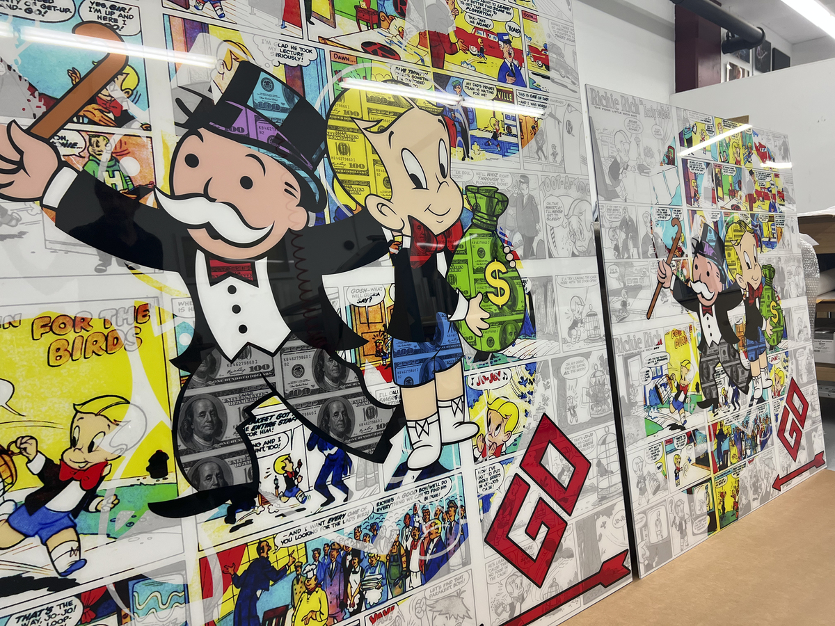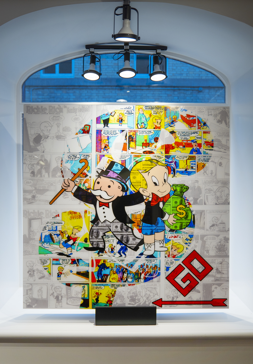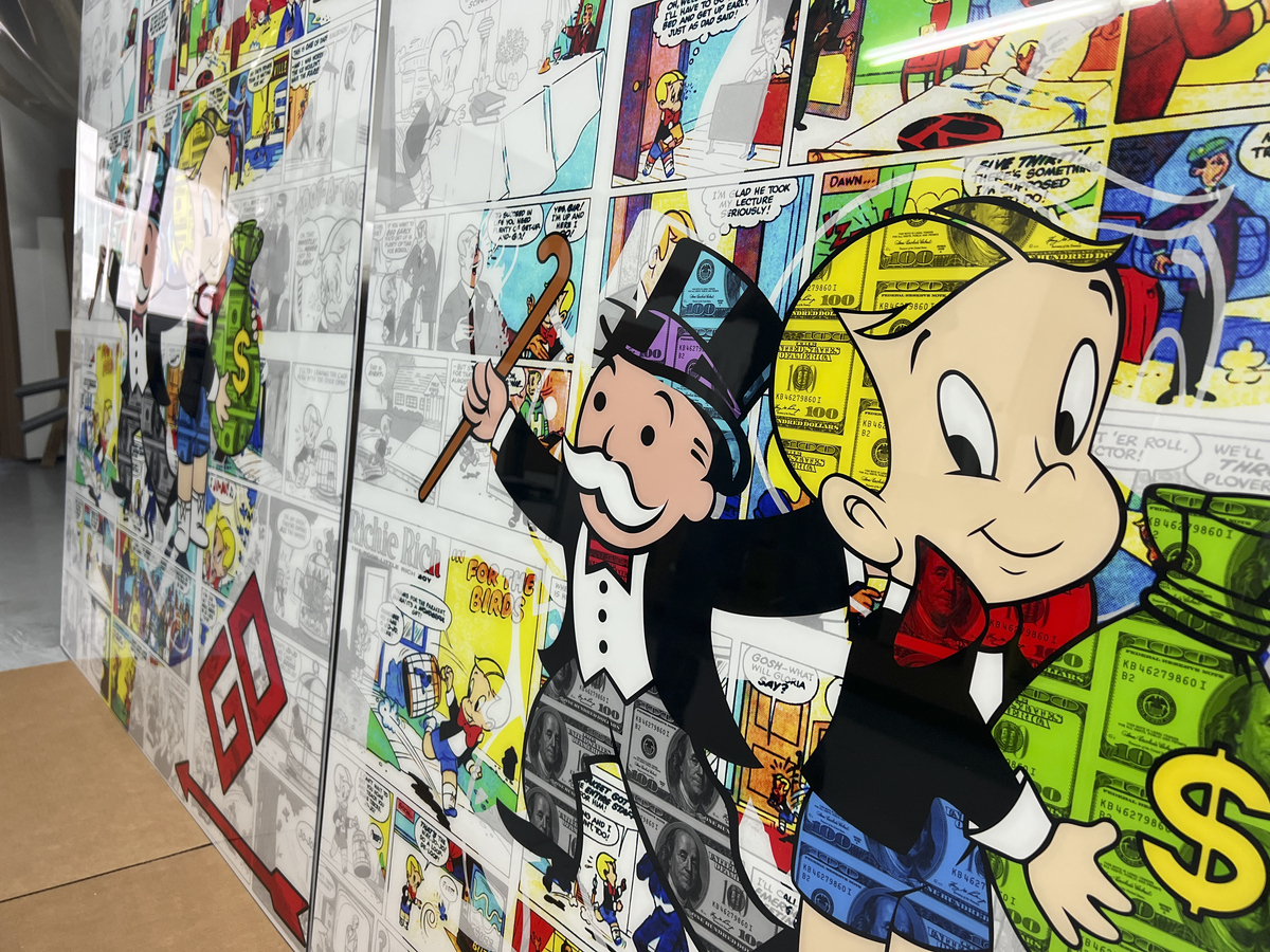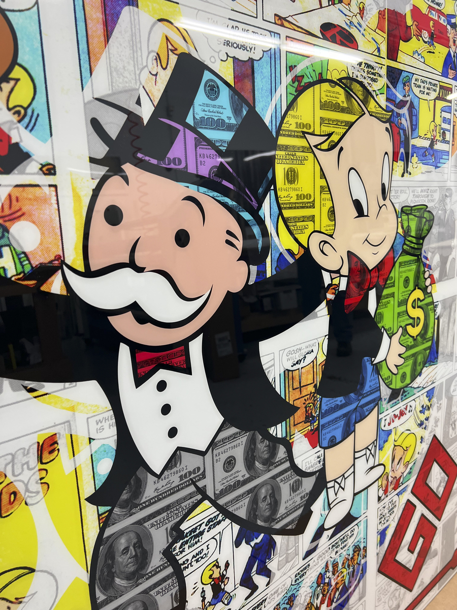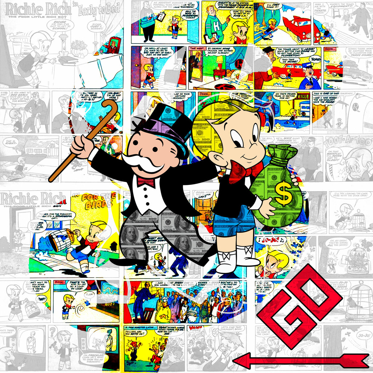 Collect $200 when you pass GO! This fresh piece depicts the Grandaddy of ‘em all, Uncle Pennybags chilling with the coolest kid on the block, Richie Rich!