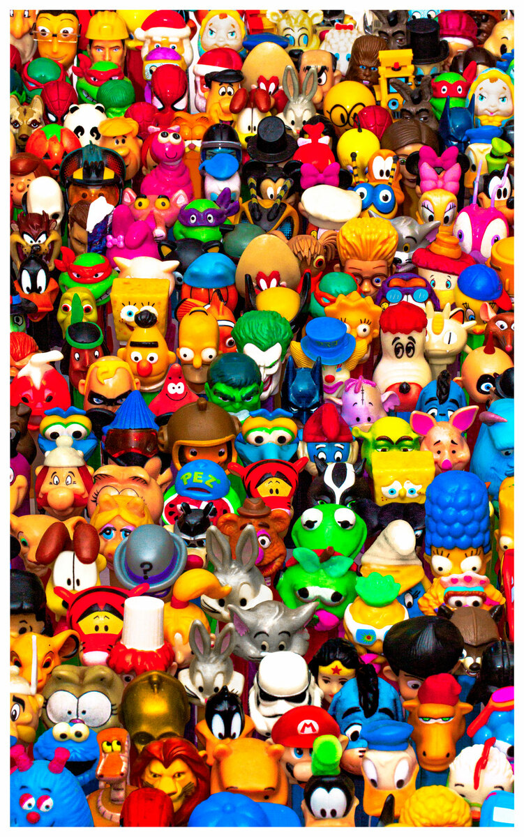 Throw it back to your childhood with this colorful and nostalgic piece of wall candy. From Batman to Donald Duck, every character you love is collected in this work.
