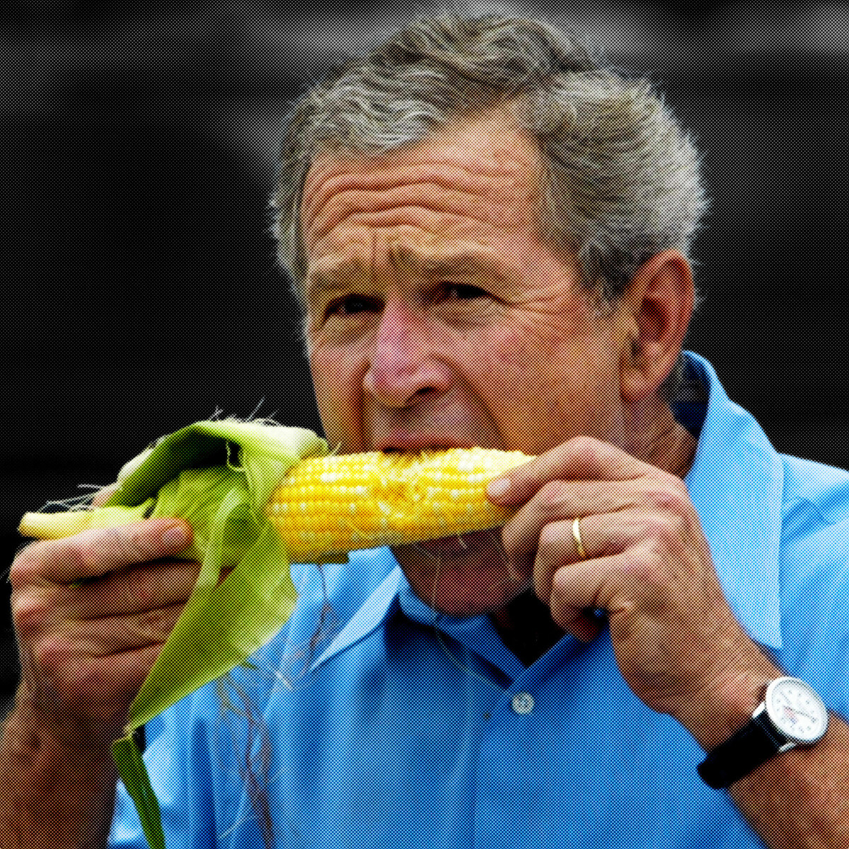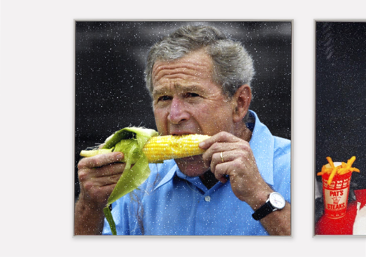 We immortalized this shot of W. taking a bite from an ear of corn being sold at a farmers market in Bettendorf, Iowa, August 4, 2004 using our shimmering technique. This piece is sure to get your friends and visitors talking!