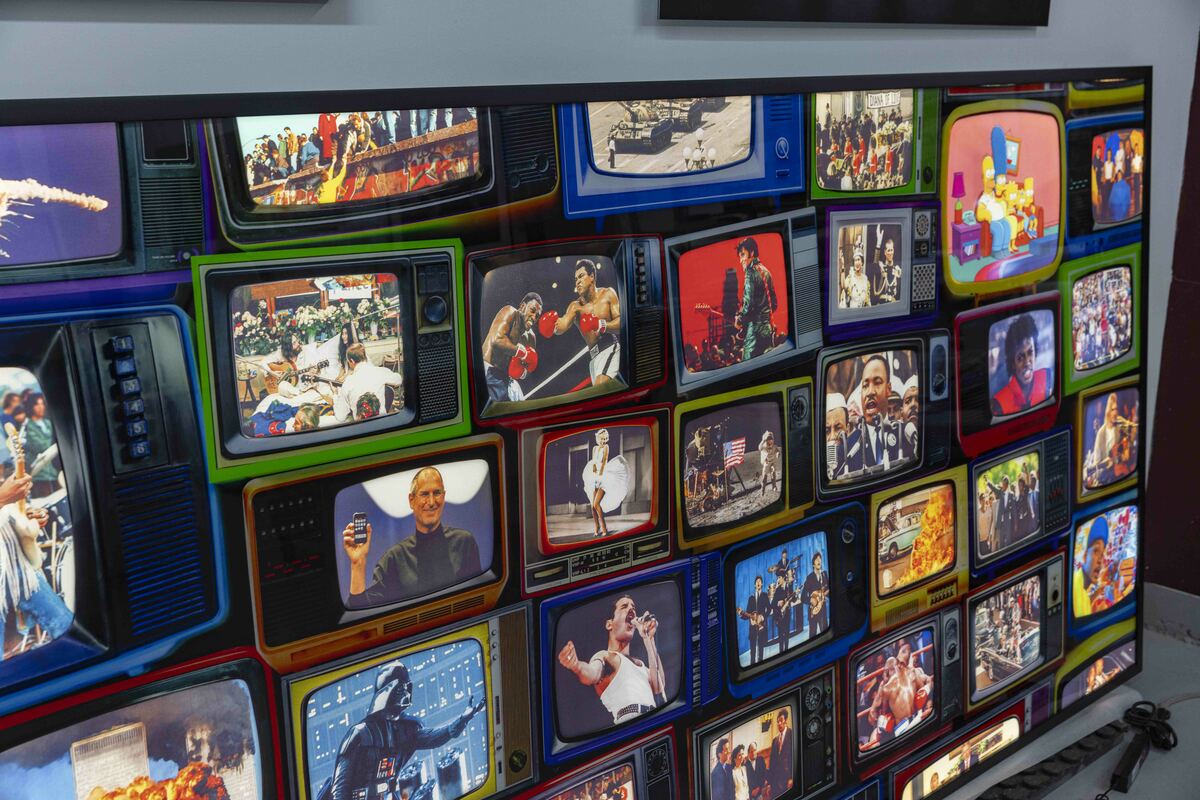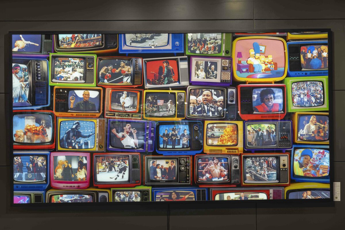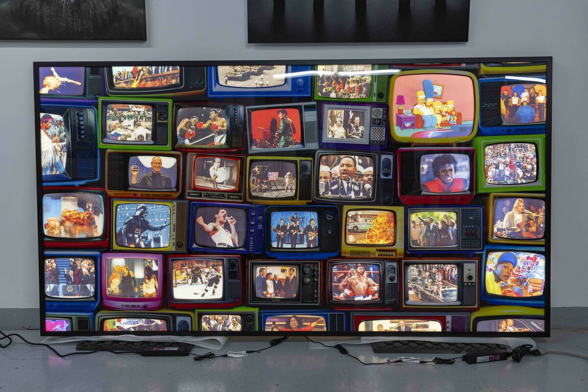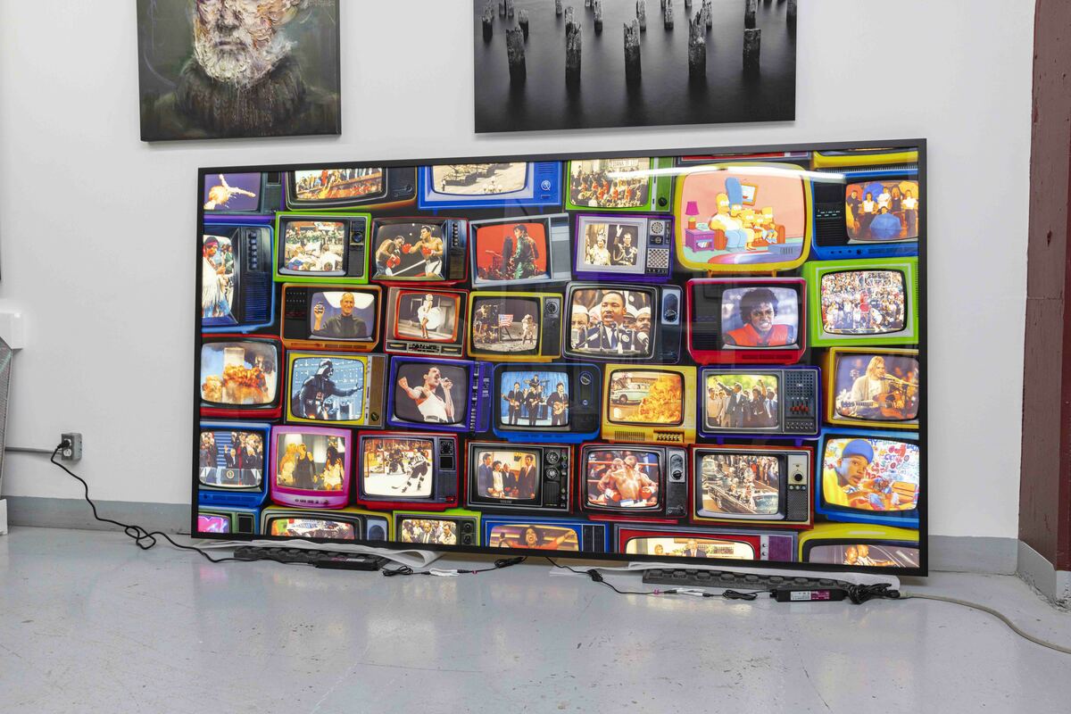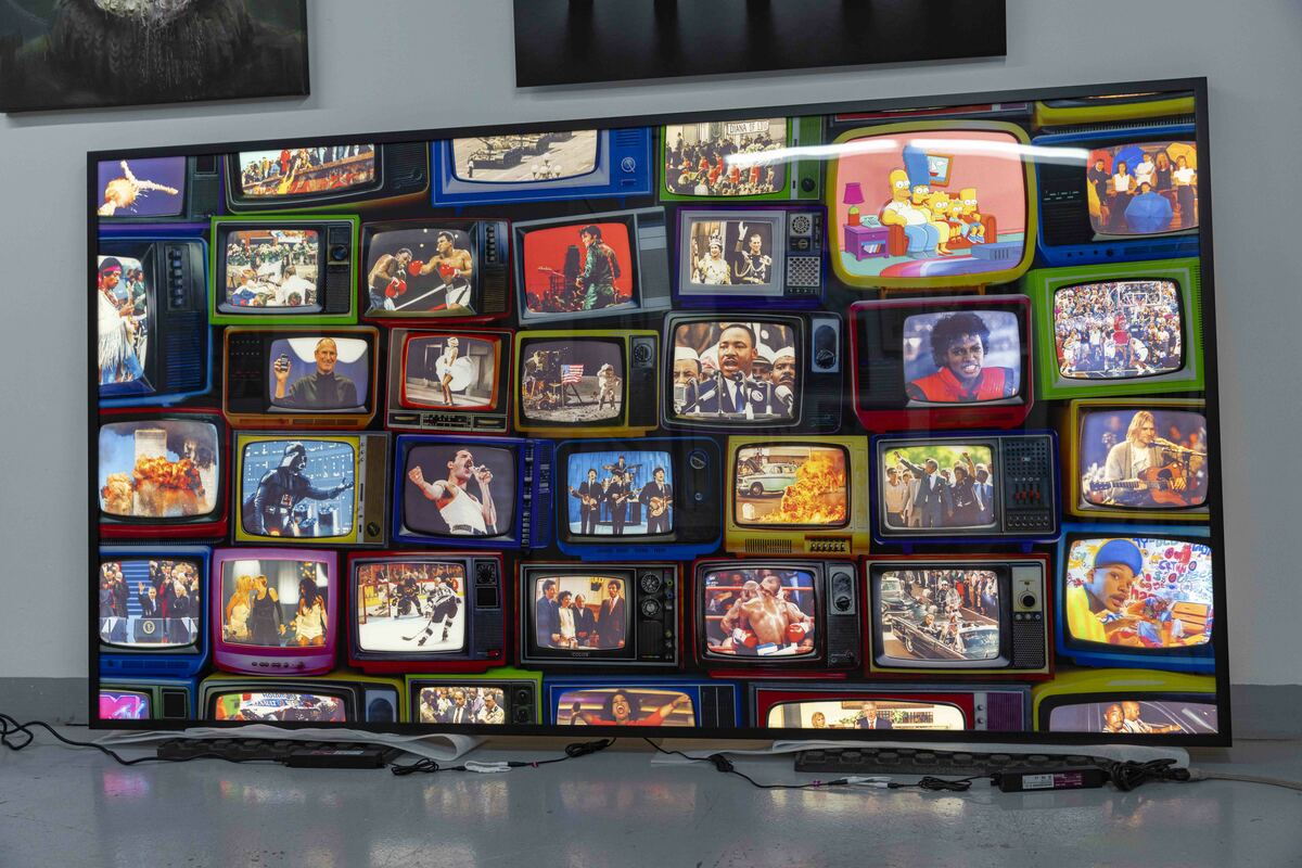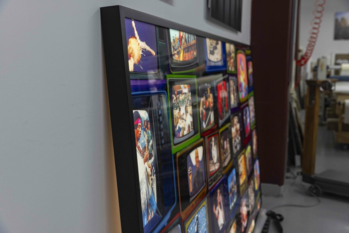 Relive Historical moments with the Tell-A-Vision Lightbox: A Journey Through Cultural Milestones. Prepare to be transported through time with the unveiling of the Tell-A-Vision Lightbox, an innovative art installation that promises to revolutionize the way we experience iconic moments from our collective past. Crafted with meticulous attention to detail, the Tell-A-Vision Lightbox stands as a testament to craftsmanship and ingenuity. This massive masterpiece is mounted to acrylic and backed on on aluminum, creating an aura of elegance and sophistication. But what truly sets it apart is its unique design – while the aluminum blocks out the back light emitted from the lightbox, the shape of the television screens are cut out of the aluminum, allowing the vivid imagery to light up when activated, offering viewers an immersive journey through history's most acclaimed, powerful and tragic televised events. From the inspiring words of Martin Luther King Jr.'s "I Have a Dream" speech to the exhilarating spectacle of the moon landing, from the cultural impact of Elvis Presley's comeback special to the unforgettable performances of Freddie Mercury at Live Aid and Jimi Hendrix at Woodstock, the Time Machine Lightbox captures the essence of these defining moments. But the Tell-a-Vision Lightbox is more than just a static display – it's a catalyst for conversation and reflection. As viewers interact with its myriad moments, they are invited to explore the interconnectedness of our shared cultural heritage and engage in discussions about history, society, and the human experience. Whether showcased in galleries, corporate offices, or private collections, the Tell-A-Vision Lightbox delivers on its name, telling a vision that promises to captivate audiences and leave a lasting impression. It's a celebration of our past, a tribute to our shared humanity, and a beacon of inspiration for generations to come. Experience history comes to life with our innovative installation, available now in a limited edition of 10 for private collectors.